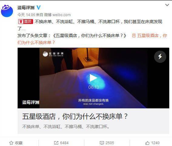 @藍莓評測官方微博稱,希望能借助本次測試引起酒店行業(yè)的重視,注重衛(wèi)生狀況與用戶體驗;并稱,國外測評機構Inside Edition曾在去年對紐約的9家酒店進行了暗訪,其中3家酒店在客人退房后未更換床單。
