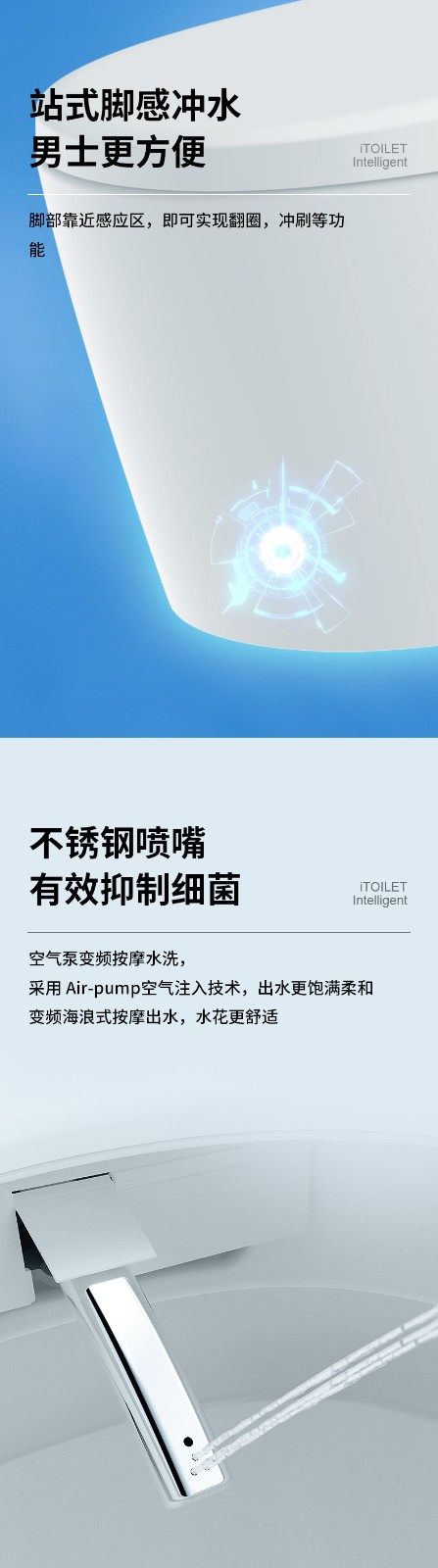 3、主要功能:AI語(yǔ)音控制(可選)、著座感應(yīng)、腳感翻蓋/翻圈/沖刷(可選)、停電(接USB)沖刷、暖風(fēng)烘干、無(wú)線遙控、凈味除臭、